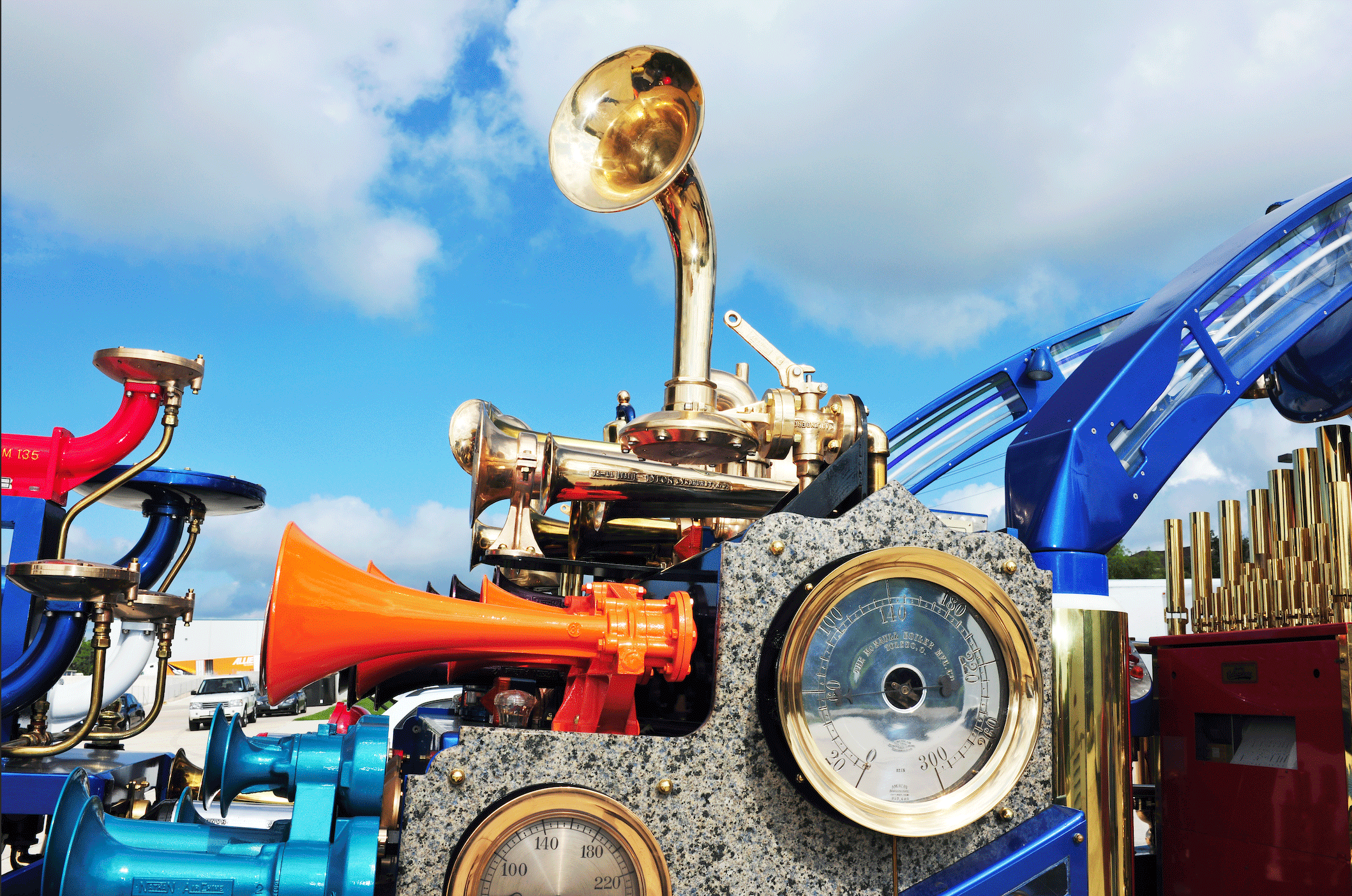 Big Horn is the world’s only bell, whistle and horn museum on wheels—and it amazes all who see and hear it.Among other accolades, the Big Horn’s one-of-a-kind Kahlenberg S-6 is the world’s largest air horn. This giant masterpiece is undoubtedly the crown jewel of the Big Horn’s collection—And thus it is utterly fitting that the official name for the vehicle would be “Big Horn.”Other assets on Big Horn’s roster of horns, bells and whistles include: a Verdin Bell carillon, a Tangley Circus Calliope, 55 antique steam whistles, 46 air whistles, 18 train, boat, submarine and truck horns, 4 ship’s horns (including the world’s largest air horn, mentioned above) 21 fire alarms, emergency, railroad trolley, fire truck and train bells, two US Navy destroyer steam sirens, one diaphone fog horn, 175 feet of multi functioned neon lights in red, white, blue, green and purple, 22 high- powered strobe lights, accessory compressor and an air-operated cockpit door, 164 cfm rotary screw compressor with 200 gallons of air storage capacity, billowing smoke machines, 300 amps of audio power, wireless PA system, remote control for audience participation, 66 electronic and mechanical gauges, 7500-watt Onan generator, a 2500-watt Heart inverter and seven 1450-amp batteries as used in the space shuttle.When it is all said and done, the final creation of Big Horn is literally a rolling masterpiece, ready to dazzle the mind and intrigue the imagination.